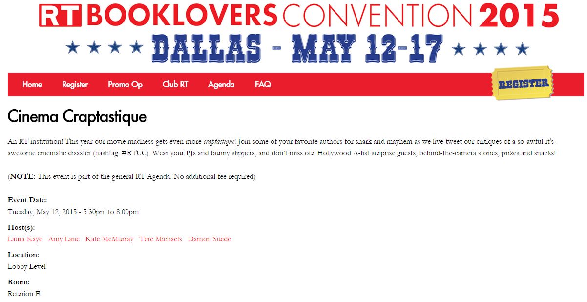 Cinema Craptastique makes it’s yearly RT Convention appearance on Tuesday, May 12th, from 5:30pm to 8:00pm CST (complete with the brilliant & hilarious Damon Suede and his equally brilliant & hilarious friends leading the shenanigans).