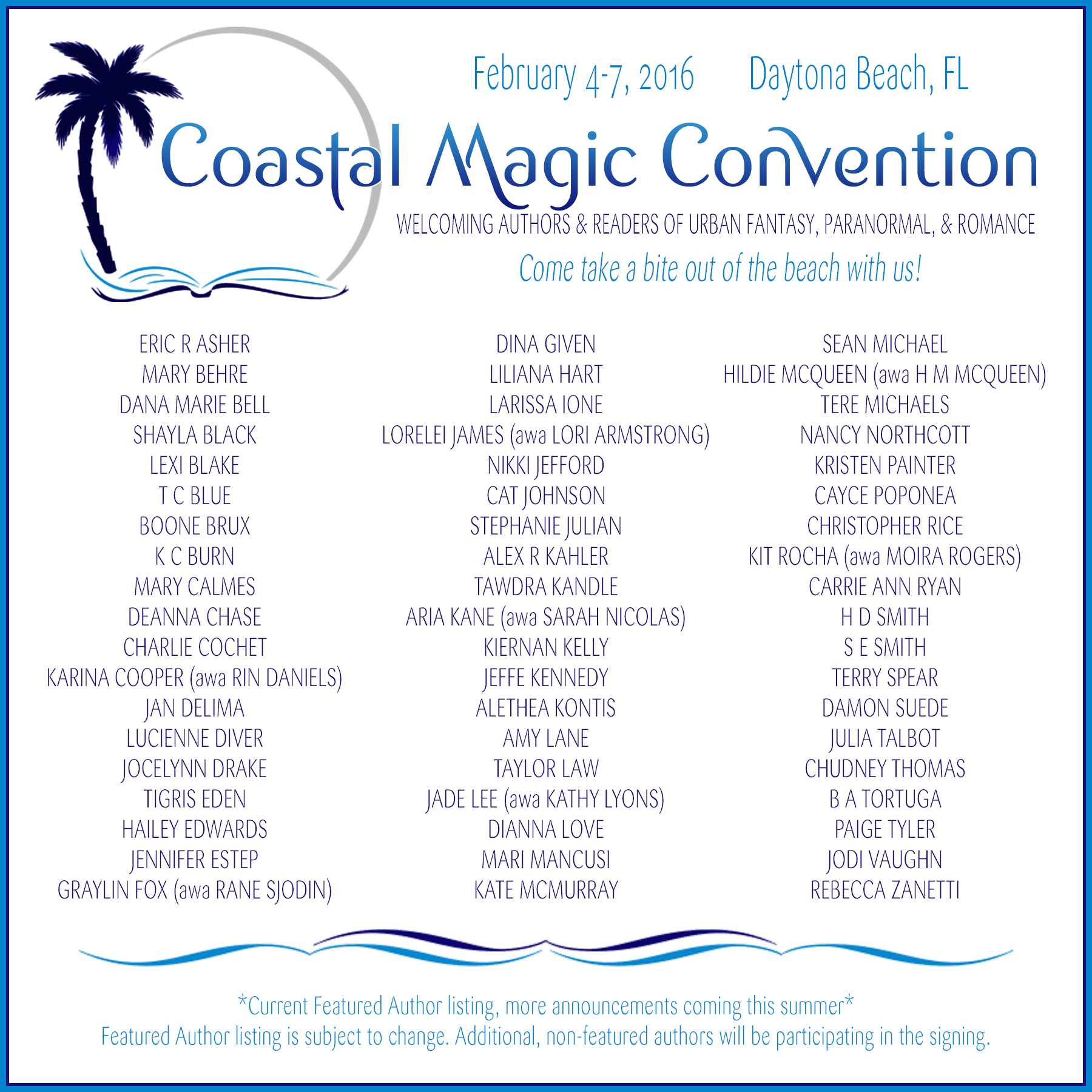 Thanks to everyone who’s been sharing the info about Coastal Magic. Word of mouth and the strength of our social media connections is the main way people find out about our little shindig. Make sure all of your reading buddies know you’re coming to hang out with us… share our info in your reading groups and book clubs. Because of YOU, and our fantabulous authors, we’re going to have an amazing February!