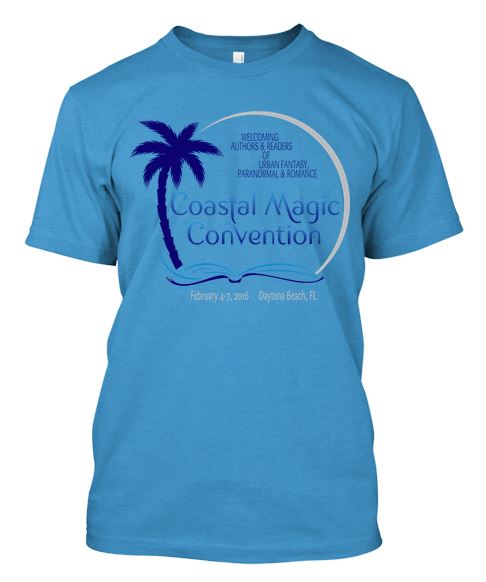 This first option is simple, just our logo and the date/location of the event. I tried to cover a variety of preferences, so there are two t-shirt styles and a tank top option. Depending on the style, you can get blue or white, and one style has sizes up to 5x. I hope, if this is your kinda thing, that you’ll find something to suit you. This is also the design I would suggest for anyone who would like to collect author signatures for a keepsake or blog giveaway.