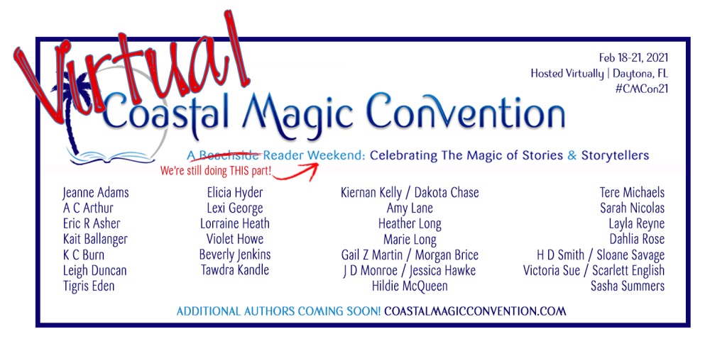 I’m in the process of updating this website to reflect all of the things we’re trying to accomplish for our 2021 event — and as always, the Coastal Magic Convention: Authors & Attendees Facebook Group is a fun place to hang out and chat all things #CMCon21.