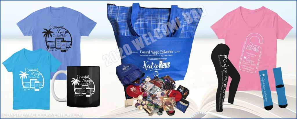 On the Virtual #CMCon21 Info page of this site, you will find individual links to purchase our 2021 Welcome Bag (yes, it will still be filled with promo goodies, bookish novelty SWAG, and books from our Featured Authors and their publishers), and four different design styles for Coastal Magic apparel! You can also search “Coastal Magic” on the TeeSpring.com website, and all four design options will pop up.